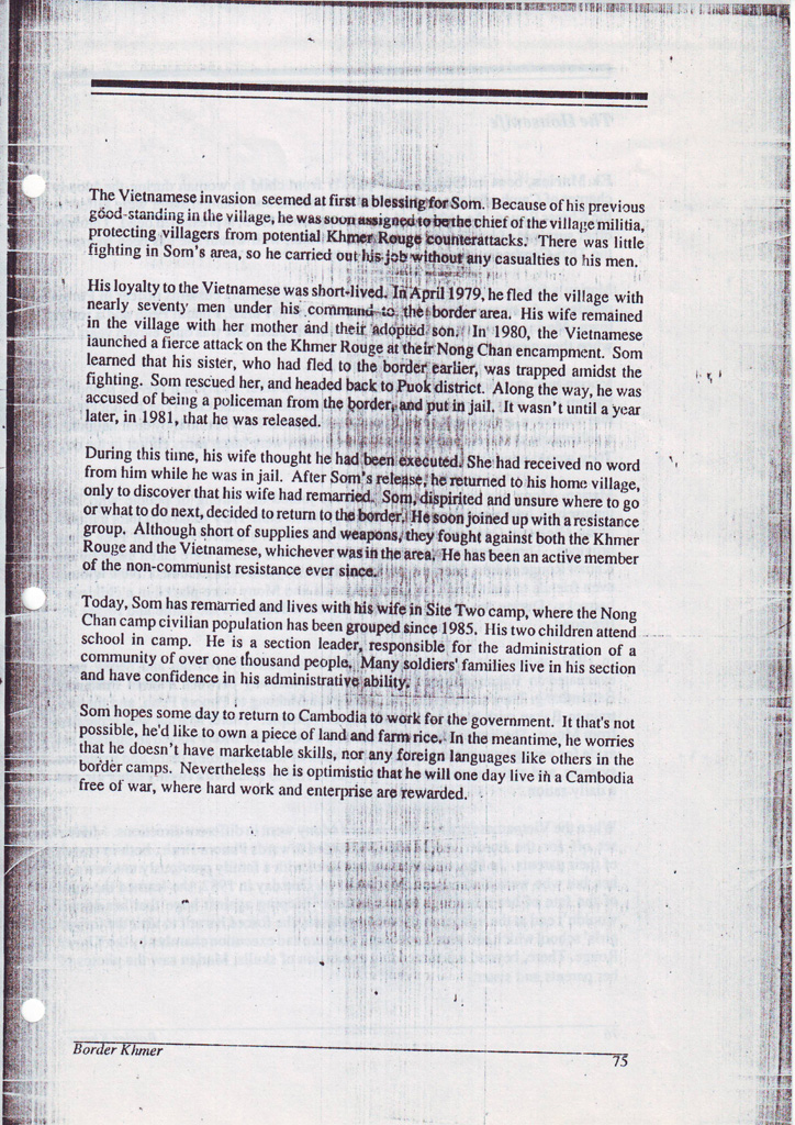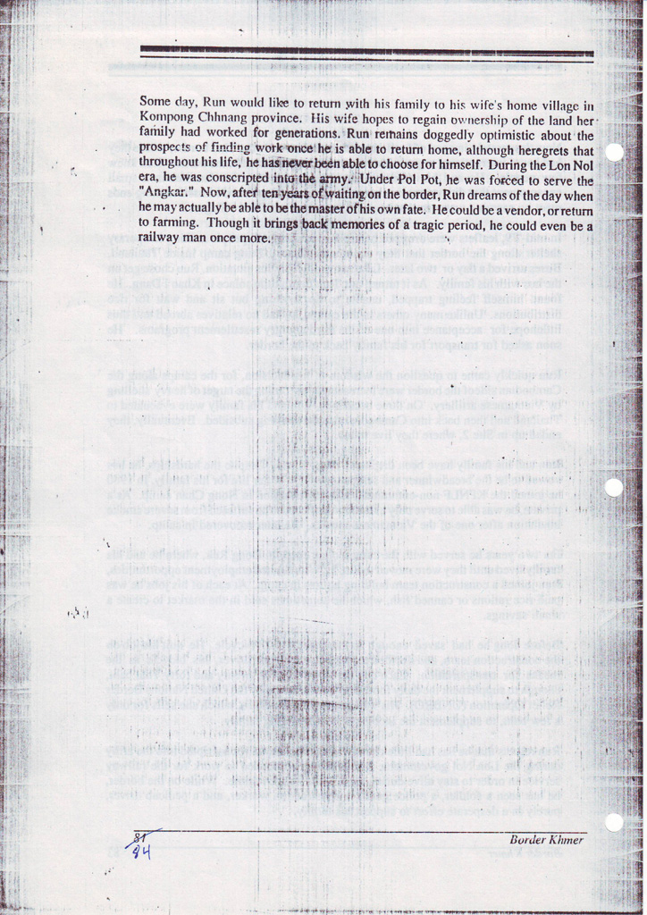 The prospect of having by the end of the study a data base replete with dozens of information fields on the border population was inspiring, but it was also daunting. The challenge was to avoid, to whatever extent possible, reducing a quarter of a million Khmer to mere figures in tables. Accompanying notes and analysis help to some degree, but the problem remains. The course decided upon was the addition of representative profiles, short summaries of the personal biographies of twelve individuals whose experiences could serve to breath life into the statistics.